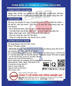 Gold Combi / Gold Mix chứa các nguyên tố trung và vi lượng quan trọng như Magie (Mg), Kẽm (Zn), Sắt (Fe), Lưu huỳnh (S), Bo (B)… được phức hợp (chelate) – một chất giúp giữ ổn định các ion kim loại và tăng khả năng hấp thu của cây trồng lên gấp nhiều lần so với dạng vô cơ thông thường.
